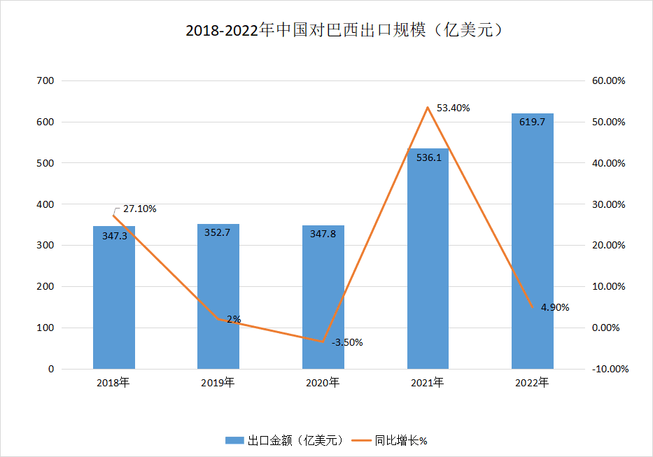 据中国海关总署统计,2022年中巴双边贸易额为1714.9亿美元,同比增长4.9%,其中中方出口额619.7亿美元,进口额1095.2亿美元。巴西是我国第九大贸易伙伴国,而我国已连续14年成为巴西第一大贸易伙伴。
